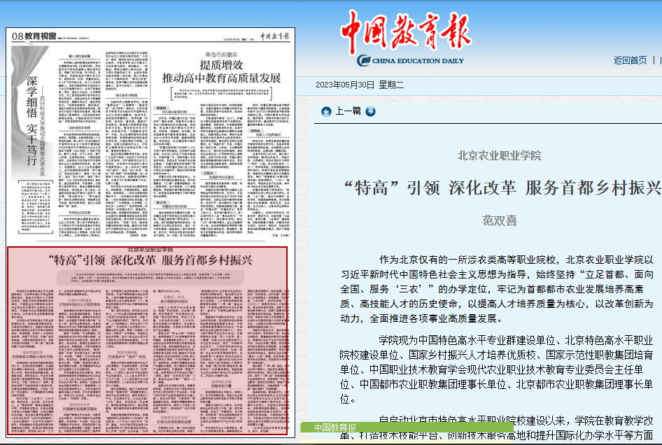 自启动北京市特色高水平职业院校建设以来,学院在教育教学改革、打造技术技能平台、创新技术服务高地和提升国际化办学水平等方面踔厉奋发、积极探索,取得了一大批标志性成果,积累了可示范、可推广的农职经验,为服务国家粮食安全、首都乡村振兴和国家“一带一路”倡议等贡献了北京农职智慧。