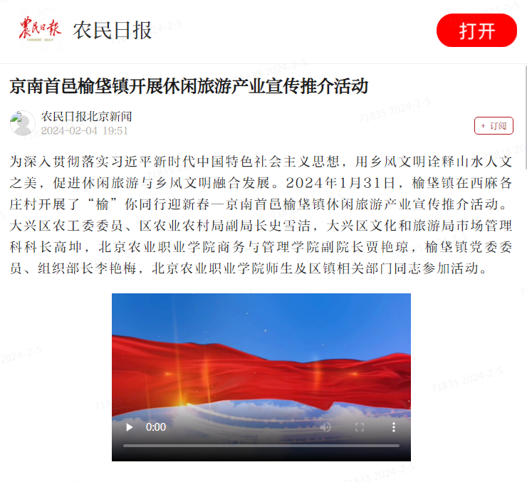 此次宣传推介活动聚焦榆垡镇旅游休闲景区、乡村旅游点、农业采摘、非遗文化传承等文旅产业,推广榆垡镇“民间文化艺术之乡”京南文化名片,以文旅产业赋能乡村振兴,展现农文旅商融合发展。