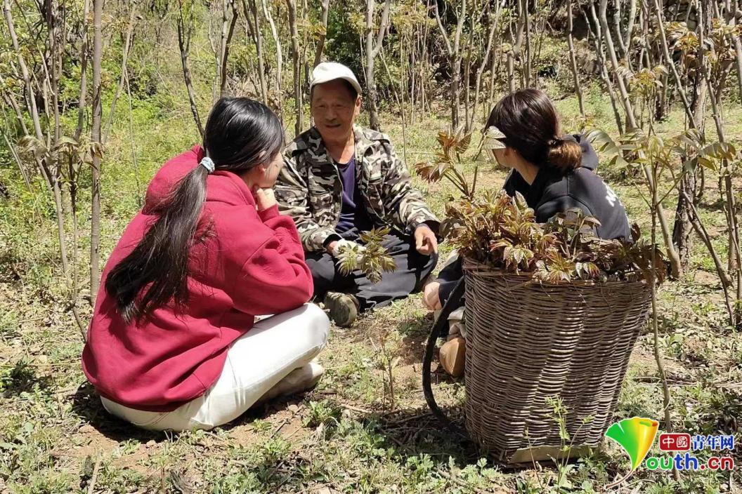 孟雨晴(左一)正在和当地村民交流香椿种植经验。本人供图