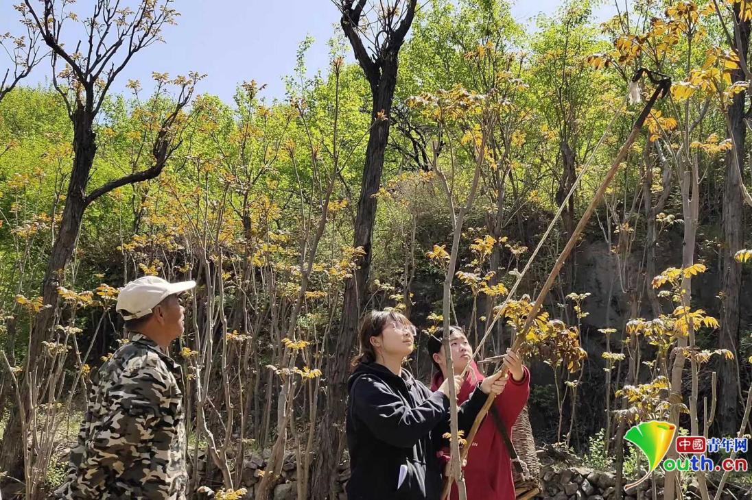 孟雨晴(右一)正在和团队伙伴一起采集香椿芽。本人供图
