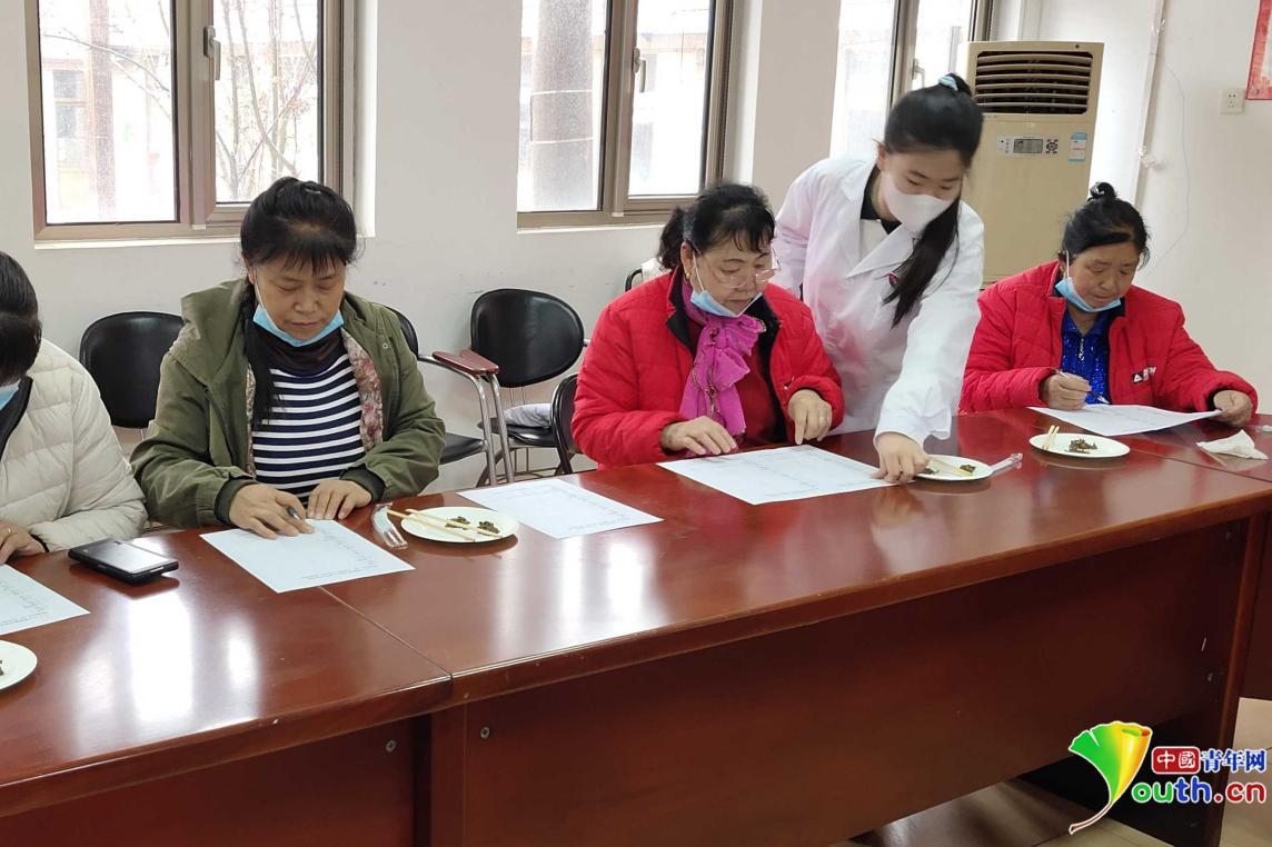 孟雨晴(右二)邀请村民品尝经过精细化加工的香椿。本人供图