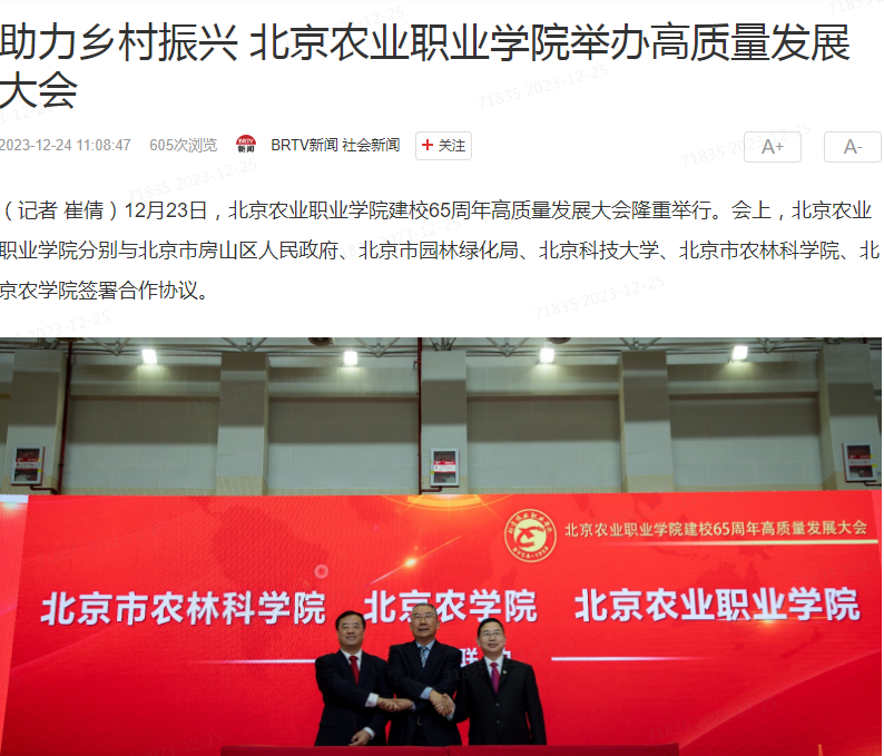 12月23日,北Beat365唯一官方网站建校65周年高质量发展大会隆重举行。会上,北Beat365唯一官方网站分别与北京市房山区人民政府、北京市园林绿化局、北京科技大学、北京市农林科学院、北京农学院签署合作协议。