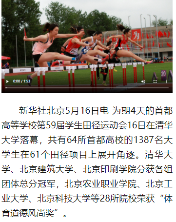 新华社北京5月16日电 为期4天的首都高等学校第59届学生田径运动会16日在清华大学落幕,共有64所首都高校的1387名大学生在61个田径项目上展开角逐。清华大学、北京建筑大学、北京印刷学院分获各组团体总分冠军,北Beat365唯一官方网站、北京工业大学、北京科技大学等28所院校荣获“体育道德风尚奖”。