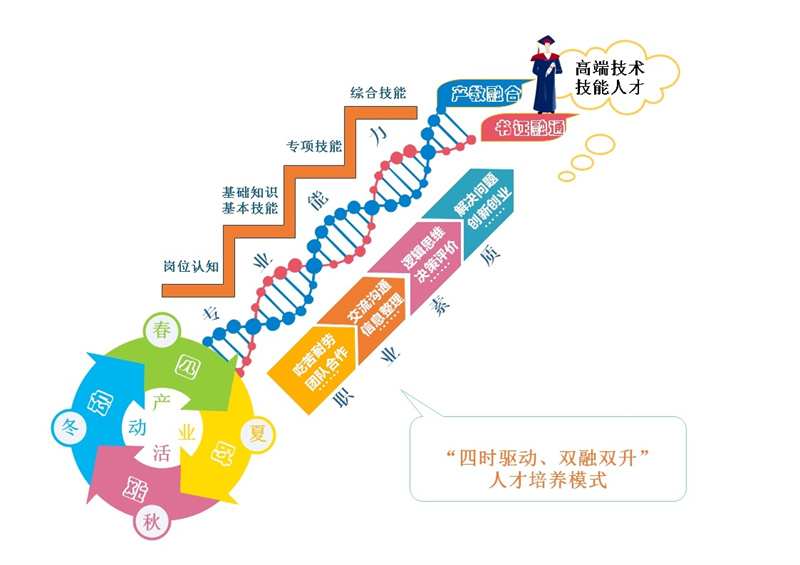 记者在调研中了解到,该校的都市园艺专业群是以园艺技术专业为核心,以园林技术、环境艺术设计和植物保护专业为支撑的专业群。该校的专业群围绕北京“四个中心”战略定位、都市现代农业“生产、生活、生态”特点,创新形成了“四时驱动、双融双升”人才培养模式。即根据四季植物生长规律和生产活动安排教学,通过产教融合和书证融通全面提升学生专业技能和职业素质,形成德技并修、工学结合的育人新模式。