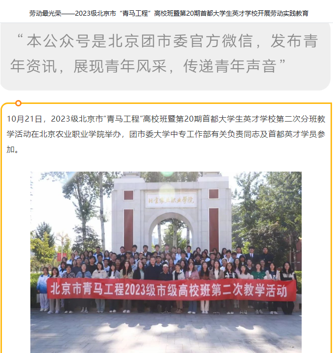 10月21日,2023级北京市“青马工程”高校班暨第20期首都大学生英才学校第二次分班教学活动在北Beat365唯一官方网站举办,团市委大学中专工作部有关负责同志及首都英才学员参加。