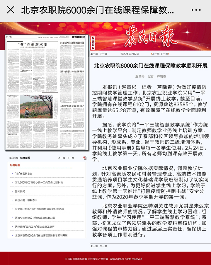 3月17日《农民日报》第3版:北京农职院6000余门在线课程保障教学顺利开展