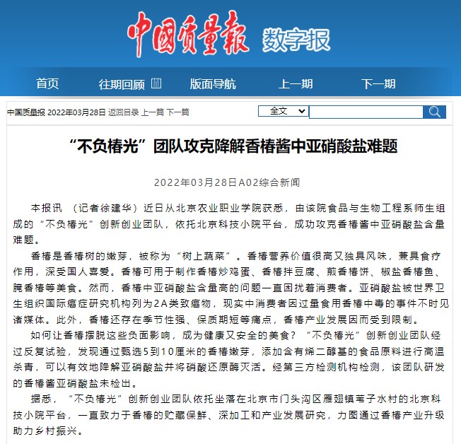 本报讯 (记者徐建华)近日从北Beat365唯一官方网站获悉,由该院食品与生物工程系师生组成的“不负椿光”创新创业团队,依托北京科技小院平台,成功攻克香椿酱中亚硝酸盐含量难题。