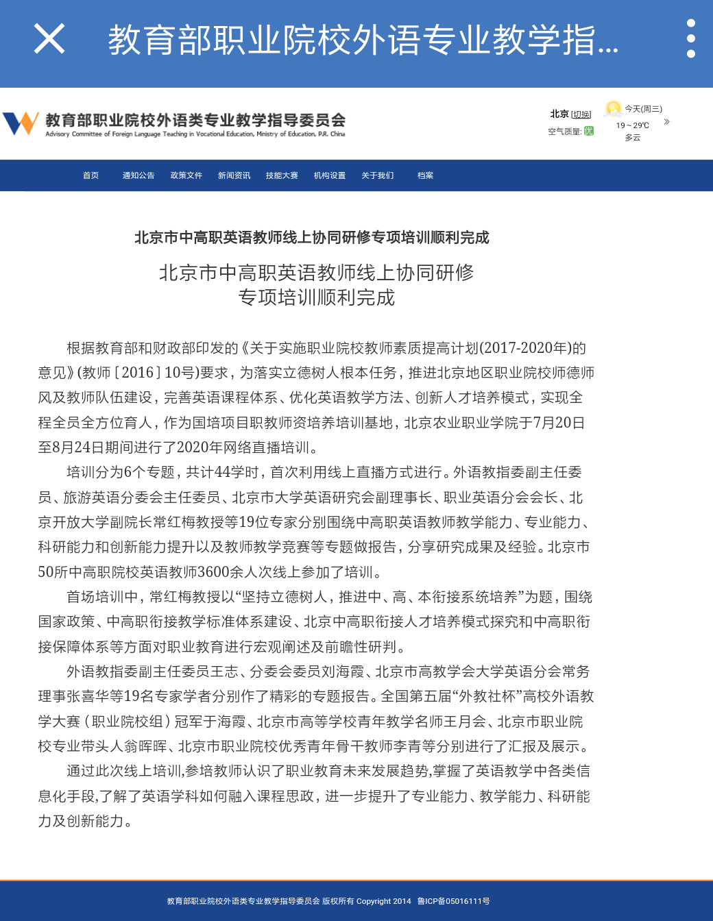 根据教育部和财政部印发的《关于实施职业院校教师素质提高计划(2017-2020年)的意见》(教师〔2016〕10号)要求,为落实立德树人根本任务,推进北京地区职业院校师德师风及教师队伍建设,完善英语课程体系、优化英语教学方法、创新人才培养模式,实现全程全员全方位育人,作为国培项目职教师资培养培训基地,北Beat365唯一官方网站于7月20日至8月24日期间进行了2020年网络直播培训。