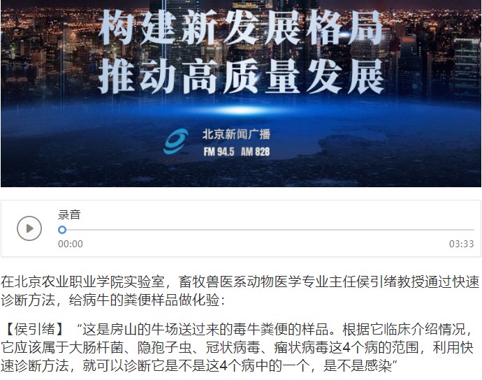 学院侯引绪教授多年来工作在教学科研与“三农”服务一线,为养殖户提供技术服务,解决养牛过程中疑难杂症,带领学生到农场实践,并把临床研究经验传授给学生,真正做到“把论文写在大地上”。12月29日,侯教授接受北京新闻广播电台采访《科技赋能,北京助力“三农”发展》。媒体链接:https://mobile.tingtingfm.com/v3/app/toutiao/detail/xGo4PwGo0L