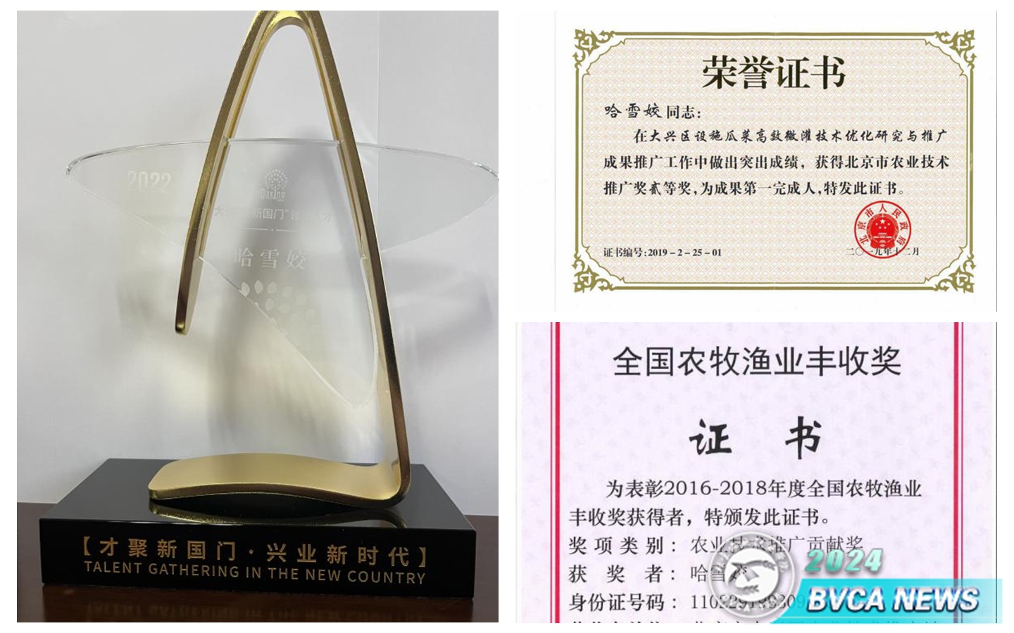 机会总是愿意给有准备且付出努力的人。哈雪姣通过做试验、写论文、考英语、考计算机,一步一步地积攒资料,如期在2012年取得了农艺师职称,并一鼓作气、一路冲刺,于2019年取得高级农艺师职称、2022年取得正高级农艺师职称。哈雪姣成为北京市大兴区种植业技术推广站最年轻的站长,她带领团队刻苦钻研,为大兴西瓜选育新优品种,成功促进大兴西瓜由中果型西瓜向高品质小果型西瓜转型,使大兴“小吊瓜”品种和栽培技术引领全国;自主创新设计“微灌溉施肥装备”,获专利两项。她先后荣获全国农牧渔业丰收奖、北京市农业技术推广奖、大兴区新国门领军人才、大兴区优秀青年人才等多个奖项,硕果累累。