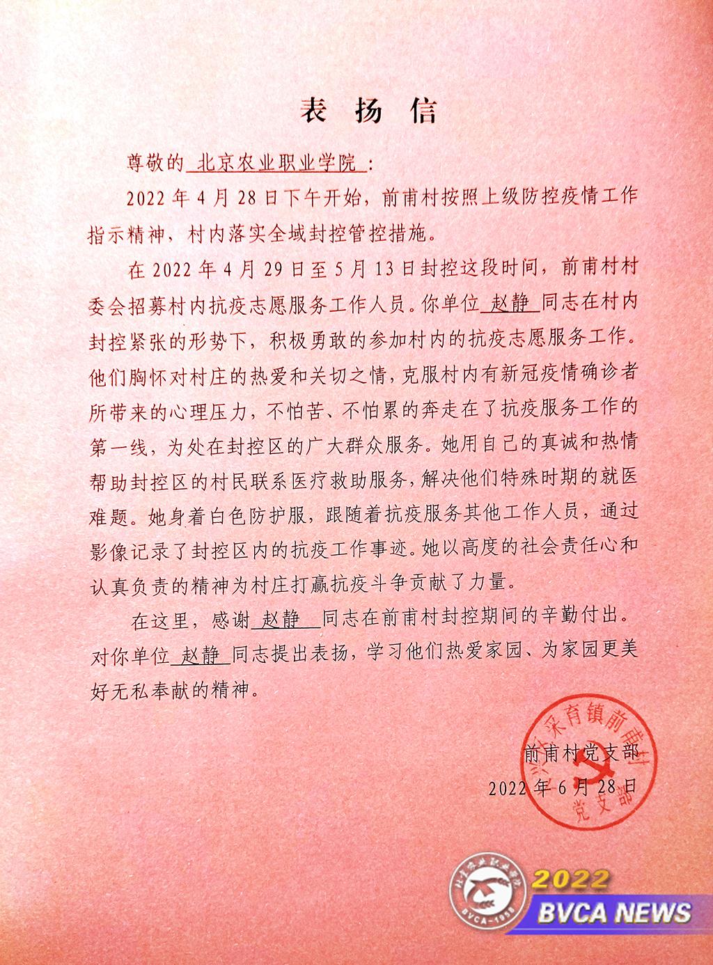 近日,学院收到来自大兴区采育镇前甫村党支部发来的表扬信,对Beat365村务管理专业20107班赵静同学积极响应村委号召,主动请缨,积极配合社区居委干部共同抗击疫情的事迹进行表扬。