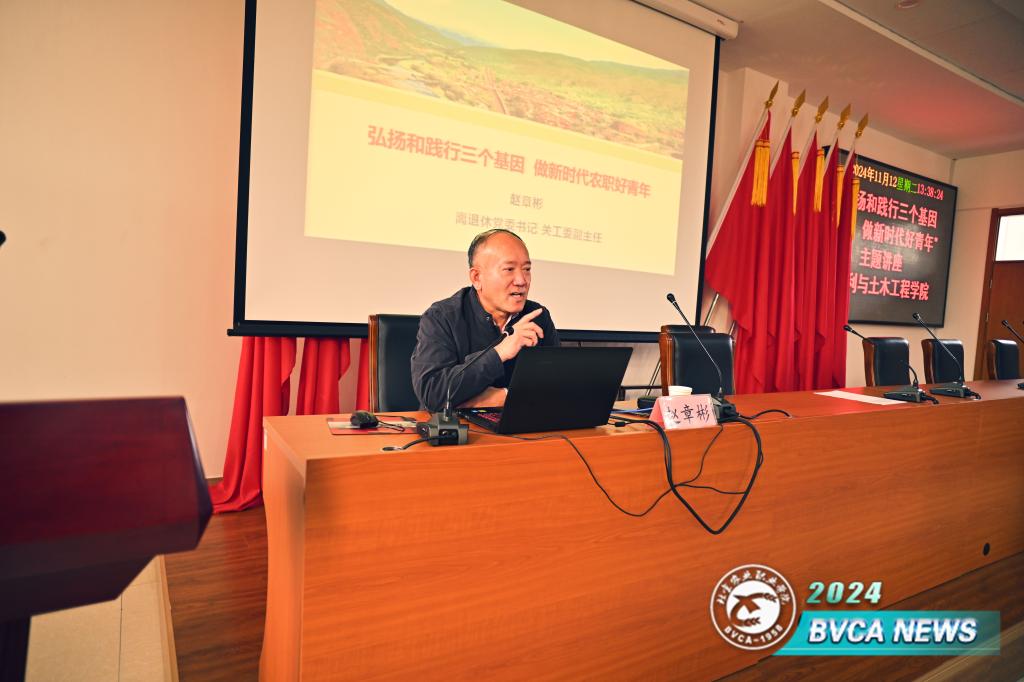 赵章彬讲述了学院66年来的办学历史,介绍了红色基因、农业基因、职教基因的内涵,他希望同学们肩负起新时代新征程党赋予的使命任务,传承和弘扬三大基因,以新时代农职好青年的良好姿态,立志为党和人民的事业不懈奋斗。