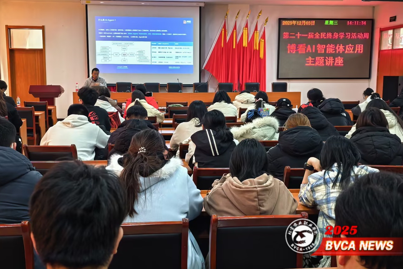 为落实北京市第二十一届全民终身学习活动周要求,普及AI智能应用知识,发挥馆内试用数据资源价值,12月3日下午,图书馆(校史馆、档案馆)联合武汉鼎森电子科技有限公司(博看),在长阳校区图书馆学术报告厅举办“博看AI智能体应用”主题讲座,系学校全民终身学习系列活动之一。