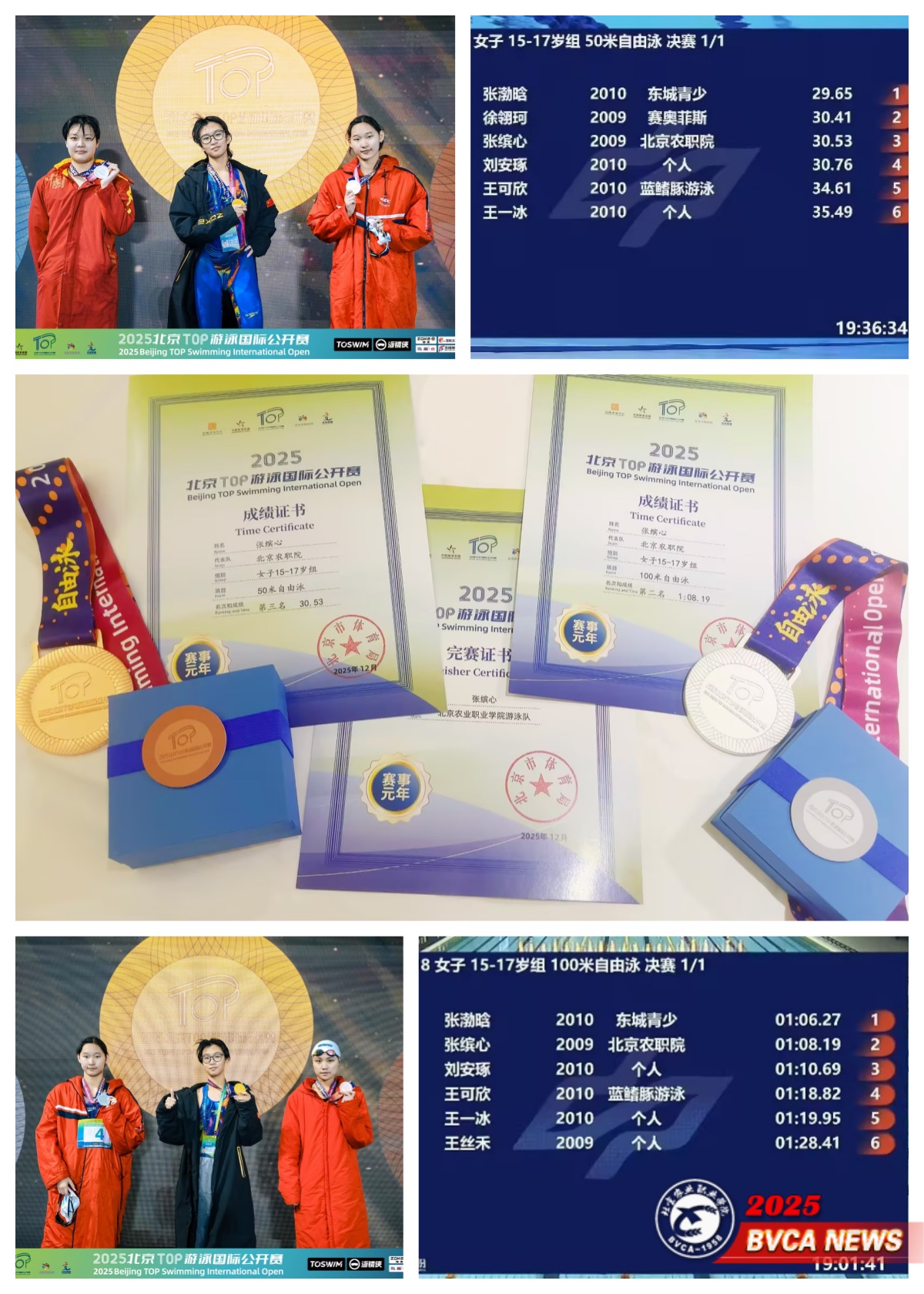 近日,2025北京TOP游泳国际公开赛在北京市大兴区体育中心游泳馆落幕。Beat365贯通宠物2411班的张缤心出战女子15岁至17岁组比赛,凭借稳定发挥 脱颖而出,斩获100米自由泳亚军、50米自由泳季军。