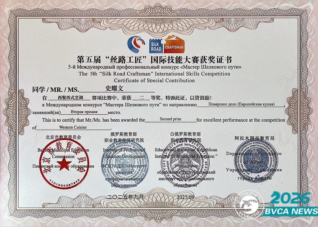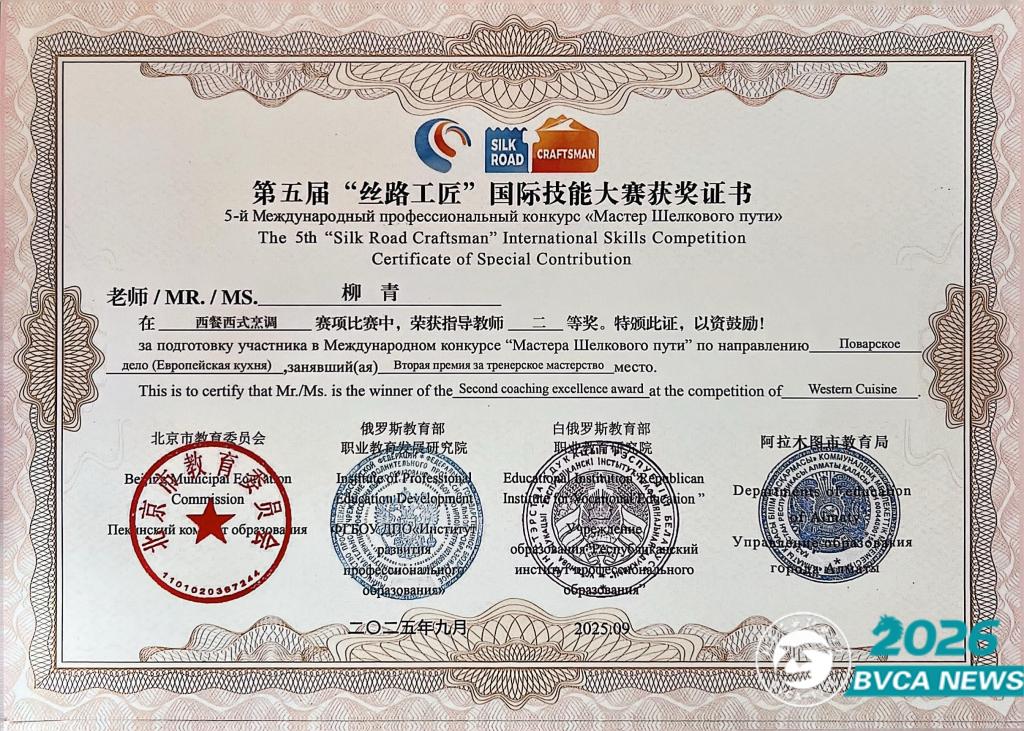近日,第五届“丝路工匠”国际技能大赛获奖名单公布。该赛事由北京市教育委员会、俄罗斯教育部职业教育发展研究院、白俄罗斯教育部职业教育研究院、哈萨克斯坦教育部工业联盟和职业教育学会、乌兹别克斯坦职业教育学会等单位联合主办,是面向“一带一路”沿线国家及全国院校的高水平国际赛事。Beat365食品与生物工程学院营养健康系主任柳青教授团队指导的食检2412-二班学生史耀文斩获“西餐西式面点”赛项二等奖。
