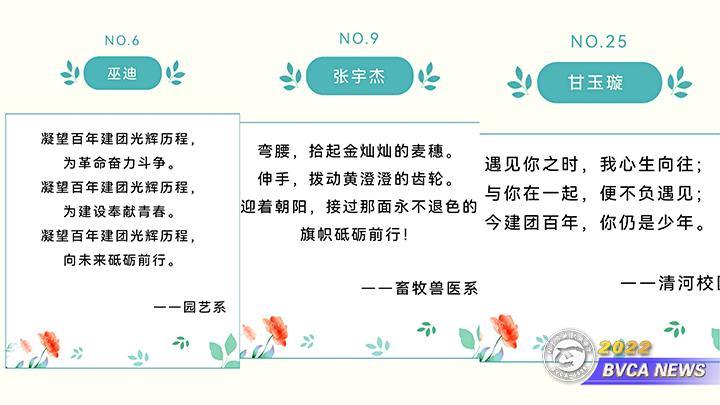 “三行情书”,一行写梦想、一行注热血、一行颂青春。文字虽短,情谊却浓,字里行间流露的尽是农职学子对共青团真挚的情感,更是对建团百年光辉历史的歌颂。团委通过此次活动,进一步引导广大团员青年坚定信心高举团旗跟党走,争做勇于担当的时代新人,共同延续中国共青团的无上荣光。