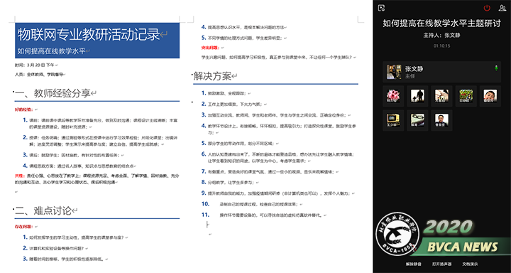 教研活动上,物联网专业教师分别就在线教学的基本情况,教学中的方法、经验、问题和难题进行了汇报。在讨论中,大家毫无保留的分享了教学中的有效方法,就如何利用现有条件做到因材施教,想学生之所想,关心关爱学生等具体情况作了交流。围绕如何更有效地组织教学,提高学生的参与度进行了讨论,并总结出十条解决方法和途径。