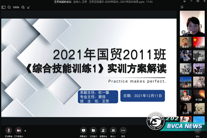 12月13日起,经济管理系国贸2011班进入6家校企合作企业,开启为期两周的校外“综合技能训练”。12月11日晚,国贸2011班召开线上家长会,解读《综合技能训练1》训练方案,系副主任杜一馨、专业主任、班主任以及17位学生家长参加会议。