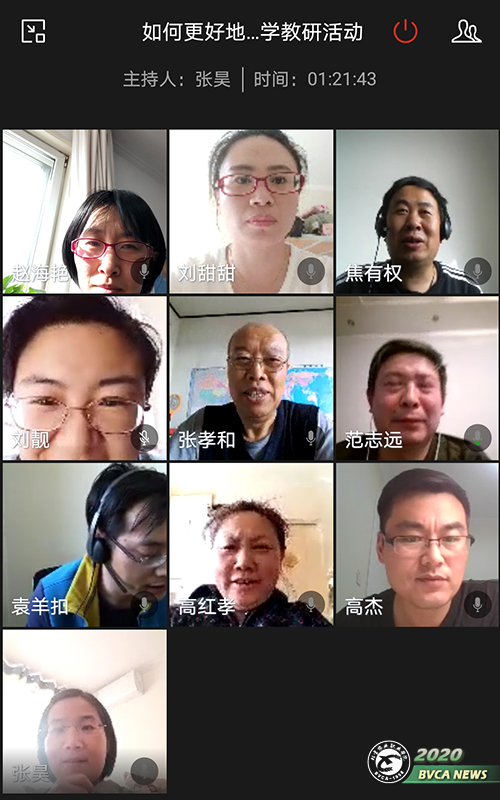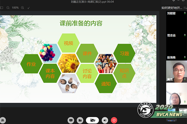 教研活动中,8名教师围绕如何开展线上教学、如何与学生互动、线上教学的问题与对策等三个议题展开论述。每位教师都精心准备了发言课件,畅谈了线上教学的体会和感悟。