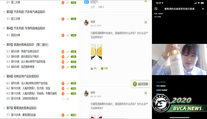 5月19日,食生系食品营养与检测专业柳青老师为国贸1911班学生讲授《外贸商品知识》课程。课程创新实训形式,为同学们开展葡萄酒品鉴居家实操云直播。同学们提前预备各项实训材料,听取讲授的葡萄酒品鉴知识和操作要求,了解产地、观色泽、闻香气、尝味道等实践参与活动。课后,同学们表示观察到葡萄酒的氧化过程,体验出回甘和香气,对葡萄酒商品特色有了全新的理解,纷纷点赞好评,希望“多安排这样的实训课”。
