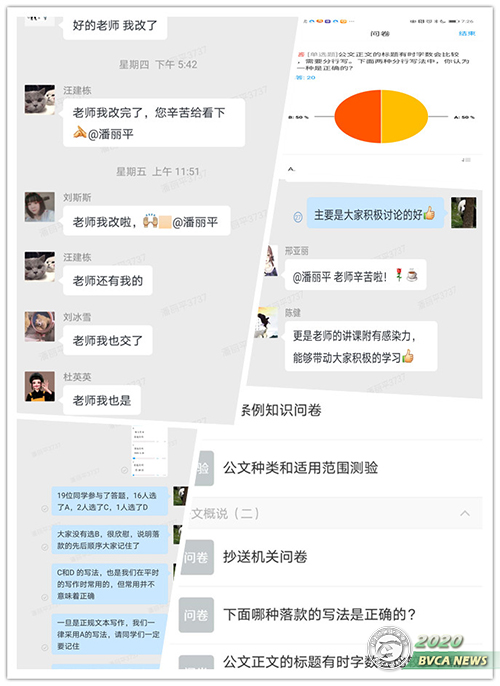 集体的力量是无穷的,每当遇到困难,组里的老师总会互相帮助、集思广益。自学院召集全院任课教师开始培训学习“一平三端”线上教学工作,不过短短2周的时间,潘丽平老师已经建设好自己负责的两门课程《高职语文2》和《农村公文写作》,在基础部分享交流会上做了一场题为《教大家如何做好同步课堂》的精彩教学示范。原来,敬业的潘丽平老师在学院集中培训前就早早开始摸索超星平台的建课模式,提前练习软件操作,大胆探索、反复试验,逐渐掌握了平台线上建课的方法和技巧,建课进程渐入佳境。线上教学中,潘丽平老师针对不同课程和授课对象,采取有针对性的课程内容设计与授课手段,利用同步课堂讲解重点知识,利用企业微信班课群开展学习互动,利用企业微信会议进行习题讲解,多途径调动学生的学习积极性。王瑞玲老师是语文组资深年长的老师,本次课程筹备她是较早完成录课的老师之一,工作之余,王老师乐于指导其他年轻老师,热心协助完成录课建课等工作。通过全体语文教师的勤勉、互助,语文教研室