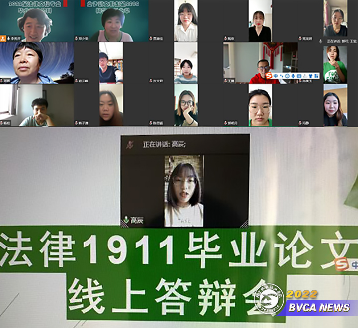 会上,答辩小组5位教师轮流担任答辩组长,32名学生按照事先确定的答辩顺序,依次答辩。发言的学生打开摄像头,进行自我介绍,讲述论文选题的由来、论文的主要内容,回答答辩小组教师的提问。学生衣着得体,论文介绍详略得当,认真回答教师精心准备的问题。指导教师做好论文答辩记录,法律1911班线上论文答辩会在大家的共同努力下顺利完成。