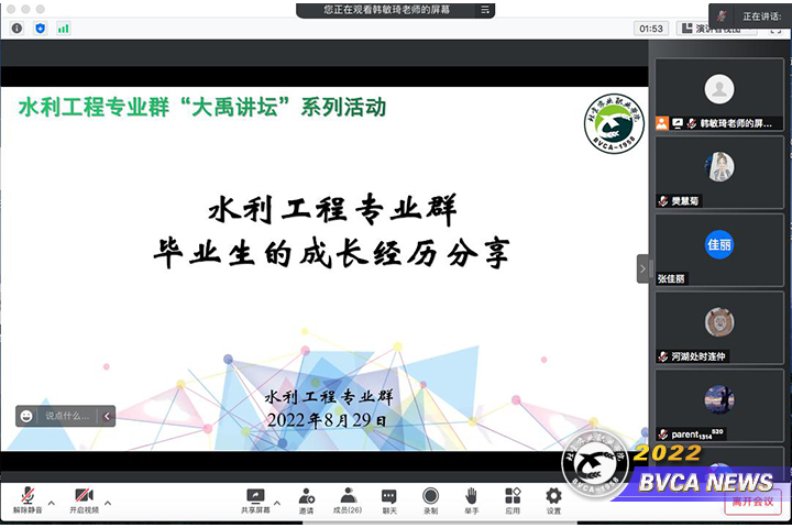 水建系水利专业为确保《水利工程施工综合实训》顶岗实习顺利实施,引导学生更准确地了解顶岗实习岗位要求和素质需求;结合2022级新生入学教育工作,水利给排水专业党支部“双带头人”教师党支部书记工作室、水利工程特高专业群、清河水利建设工程师学院结合系部“大禹讲坛”活动的统筹安排,8月29日邀请了三位在不同单位、不同岗位就业的老毕业生开展了《水利工程专业群毕业生的成长经历分享》专题讲座;8月31日邀请了紧密型校企合作单位——北京京水建设集团有限公司人力资源部部长安燃开展了《企业领导讲述眼中的优秀职工》专题讲座,水利专业本学期顶岗实习学生、2022级水利专业新生、水利专业全体教师共计90余人,参加了本次“大禹讲坛”系列活动。