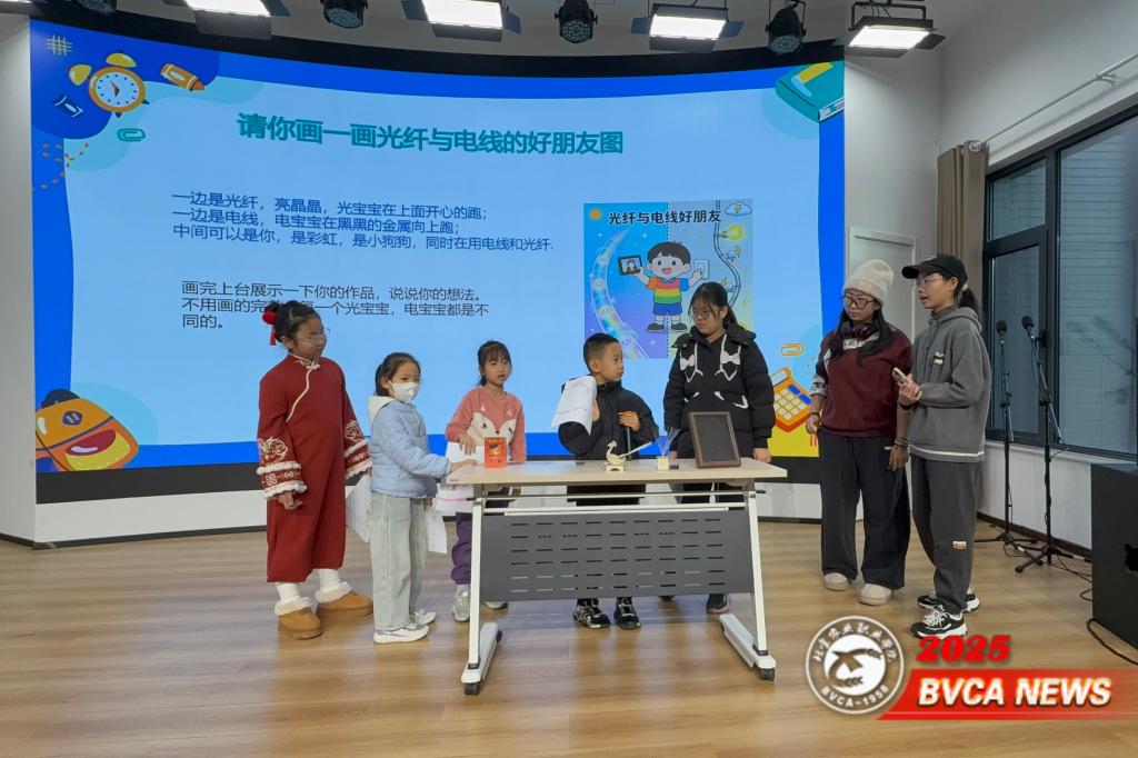 同学们采用“魔法套装”“玩滑梯游戏”“干活能力大比拼”等幼龄化表达帮助小朋友们理解光纤,现场互动踊跃。活动中,孩子们用彩笔描绘心中的光纤和电线,作品呈现“光之隧道”穿越星空、“电流轨道”环绕地球的创意。