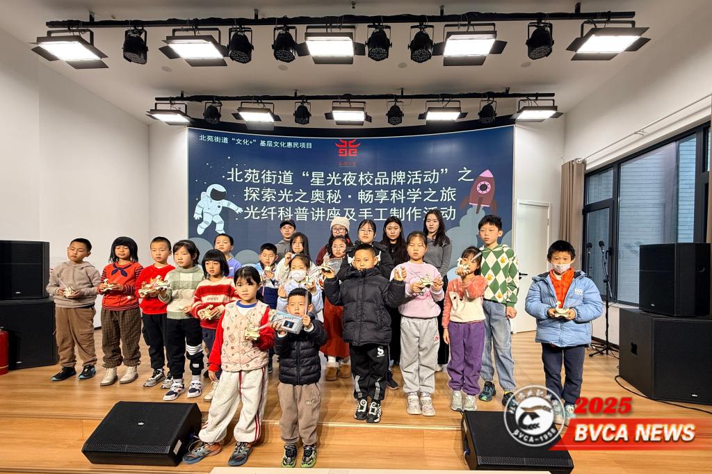 在学生们的指导下,孩子们动手组装材料、连接电路,完成孔雀光纤灯制作,灯光在光纤中跳跃,宛如星光。活动尾声,孩子们手持自制光纤灯合影。北苑街道负责人表示希望通过活动激发小朋友们的探索热情,让“光速科技”的种子在童心扎根。