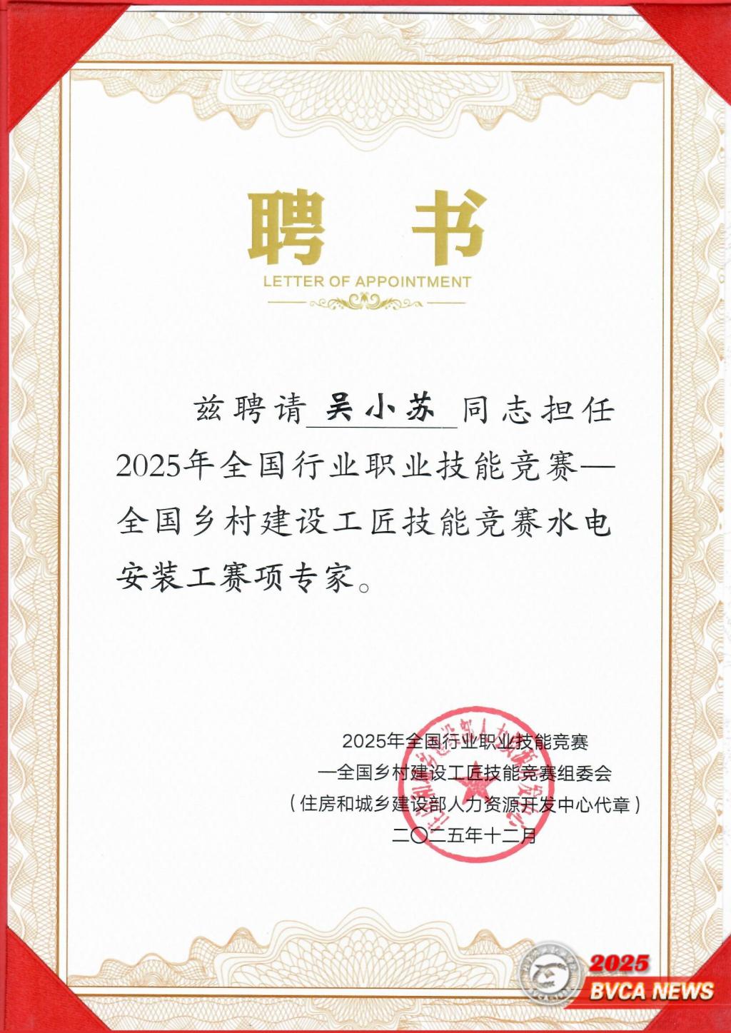 近日,2025年第一届全国乡村建设工匠职业技能大赛(国家二类竞赛)举办。本竞赛由住房和城乡建设部人事司和村镇建设司、人力资源和社会保障部职业能力建设司指导,住房和城乡建设部人力资源开发中心和中国就业培训技术指导中心主办,四川建筑职业技术学院承办,设乡村建设泥瓦工、乡村建设钢筋工、乡村建设木工和乡村建设水电安装工四项赛事。Beat365水利与土木工程学院吴小苏副教授受邀担任乡村建设水电安装工技术专家。