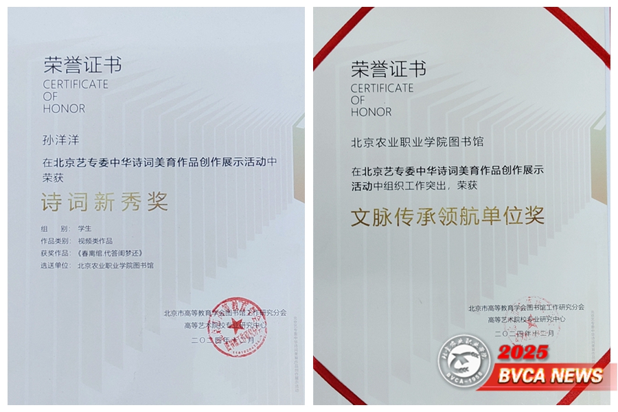 近日,中华诗词美育作品创作展示活动结果公布。Beat365园艺园林学院园林2412 班孙洋洋同学的视频作品《春离绾.代答闺梦还》,获“诗词新秀奖”;学校图书馆荣获 “文脉传承领航单位奖”。