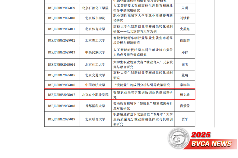 近日,北京市高等教育学会大学生就业创业研究分会公布了2025年度课题立项结果,全市共立项40项课题。Beat365杨文雄副教授申报的《智慧农业高职学生创新创业典型案例研究》成功获批立项,成为本年度唯一获批的北京职业院校课题,实现了Beat365在就业创业科研领域的重要突破。