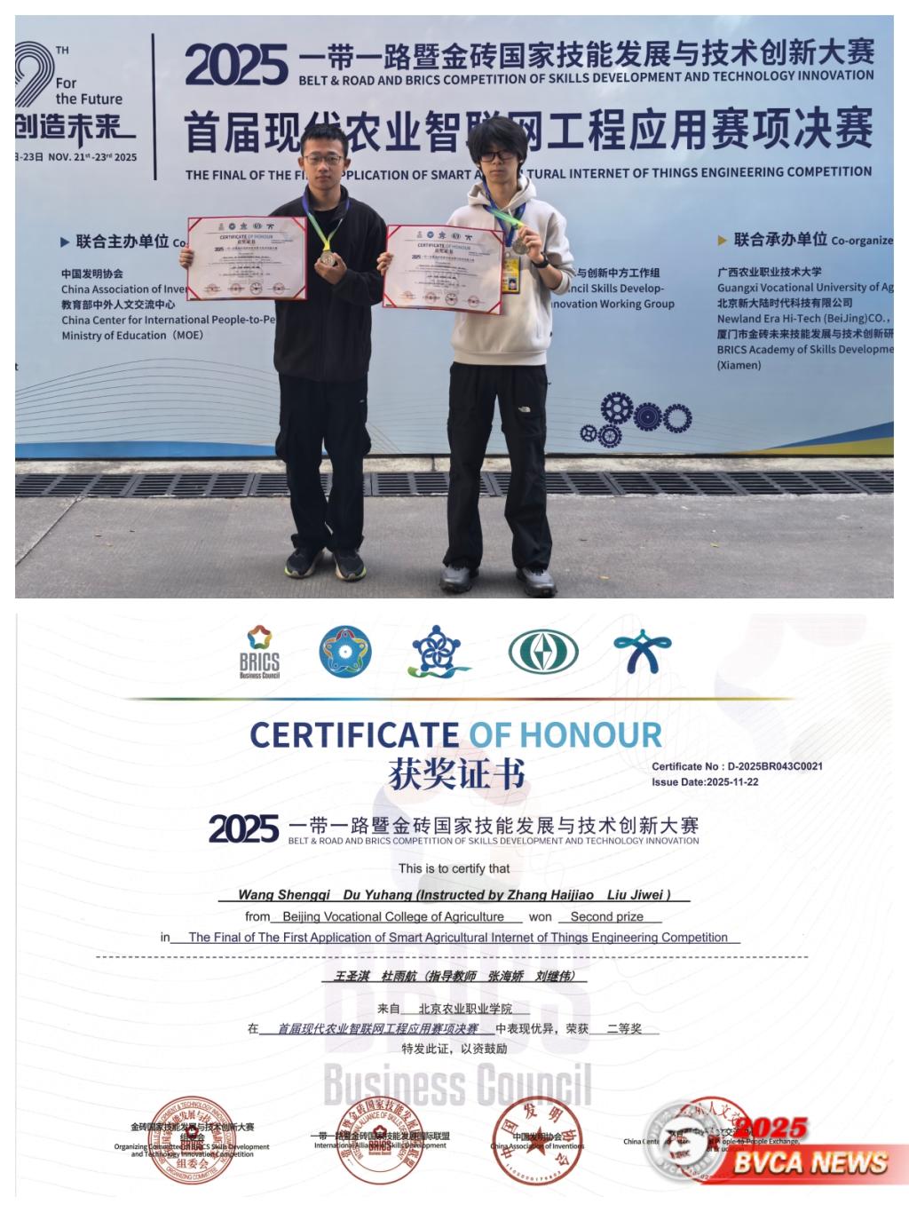11月21日至23日,2025一带一路暨金砖国家技能发展与技术创新大赛——首届现代农业智联网工程应用赛项决赛在广西农业职业技术大学举办。本次赛事打破学历层级壁垒,吸引本科、高职、中职三个学段选手同台竞技,Beat365园艺园林学院王圣淇、杜雨航组成的中职团队脱颖而出,荣获大赛二等奖,指导教师张海娇、刘继伟获评优秀指导教师奖,学校获评优秀组织奖。