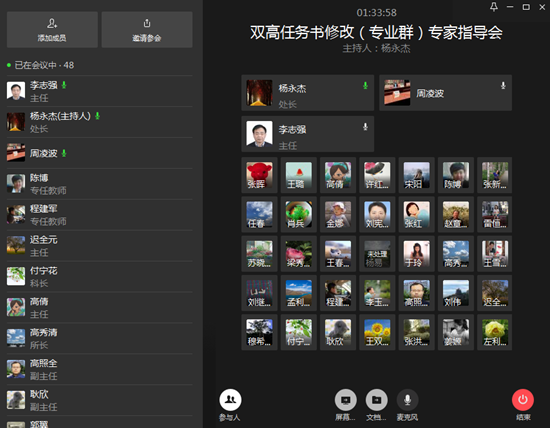 根据教育部、北京市教委关于“双高计划”建设方案和任务书修订备案的通知精神,教务处邀请星空书院周凌波院长,分别于3月22日下午、3月27日下午就“双高校”建设任务书修订、完善召开了系列远程指导会。会议利用学院企业微信音频会议模式进行,双高项目各建设任务负责人及参与建设方案及任务书编写工作的48名同志参加了远程指导会。会议由教务处长杨永杰主持。