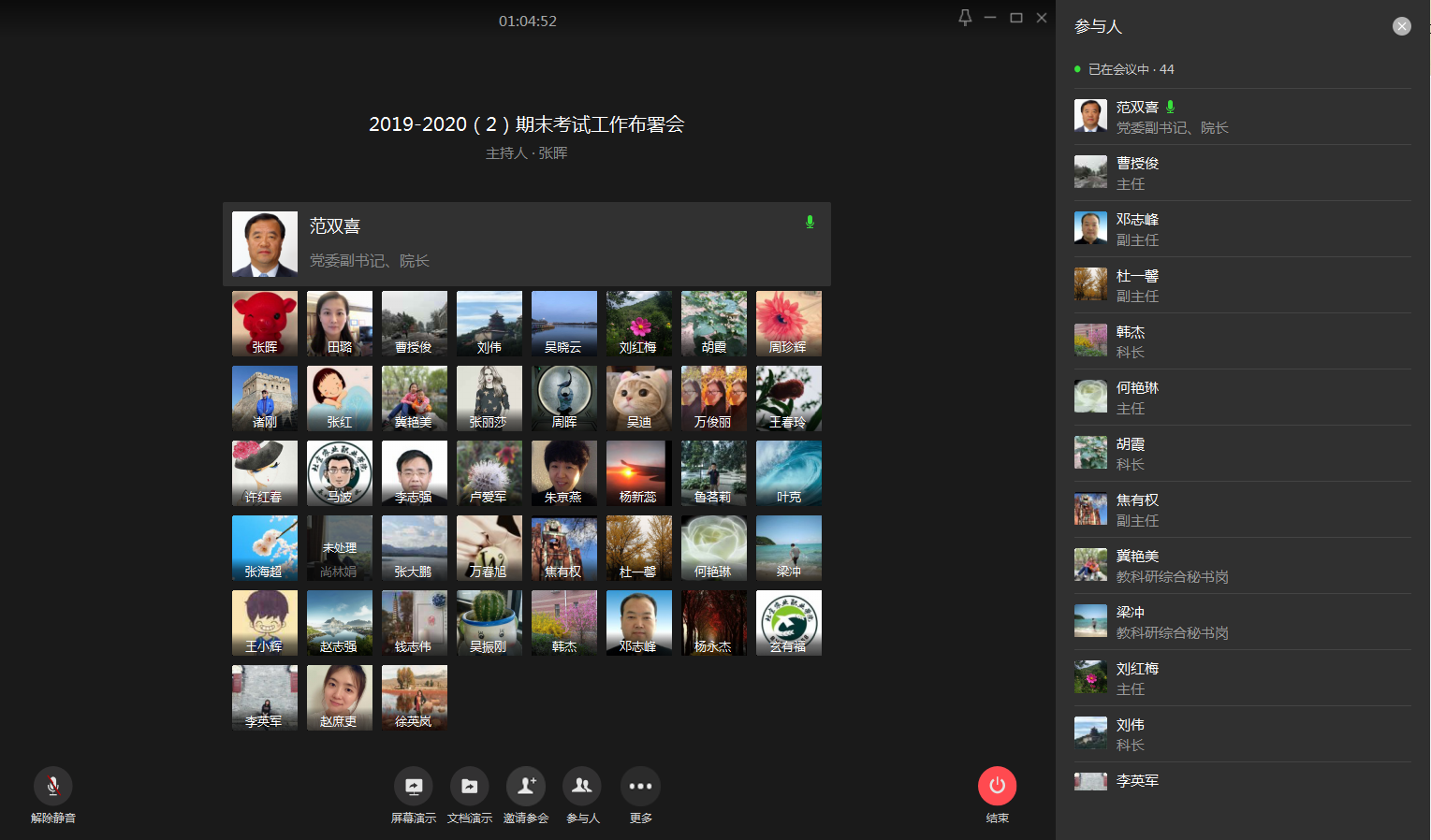 范双喜院长在总结讲话中充分肯定本学期线上教学工作,感谢广大教师在疫情防控期间的辛勤工作。对期末考试工作提出了四点要求。一是要高度重视,善始善终,各教学部门务必高度重视线上考核工作,为本学期线上教学工作画上圆满句号。二是要精心组织,妥善安排,各教学单位要全面摸查线上考核中存在的各类问题,确保每一位学生的考试权利不受损,做到应考尽考,创造良好的考试氛围。三是要做好演练工作,做好应急预案,保障考试工作顺利进行。四是要落实落细,完善环节,各教学单位要做好任务分解,抓好每个工作环节。确保本学期线上教学工作完美收官。