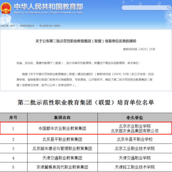 近日,教育部公布全国第二批示范性职业教育集团(联盟)名单,学院和北京首农食品集团有限公司牵头成立的中国都市农业职业教育集团成功入选。