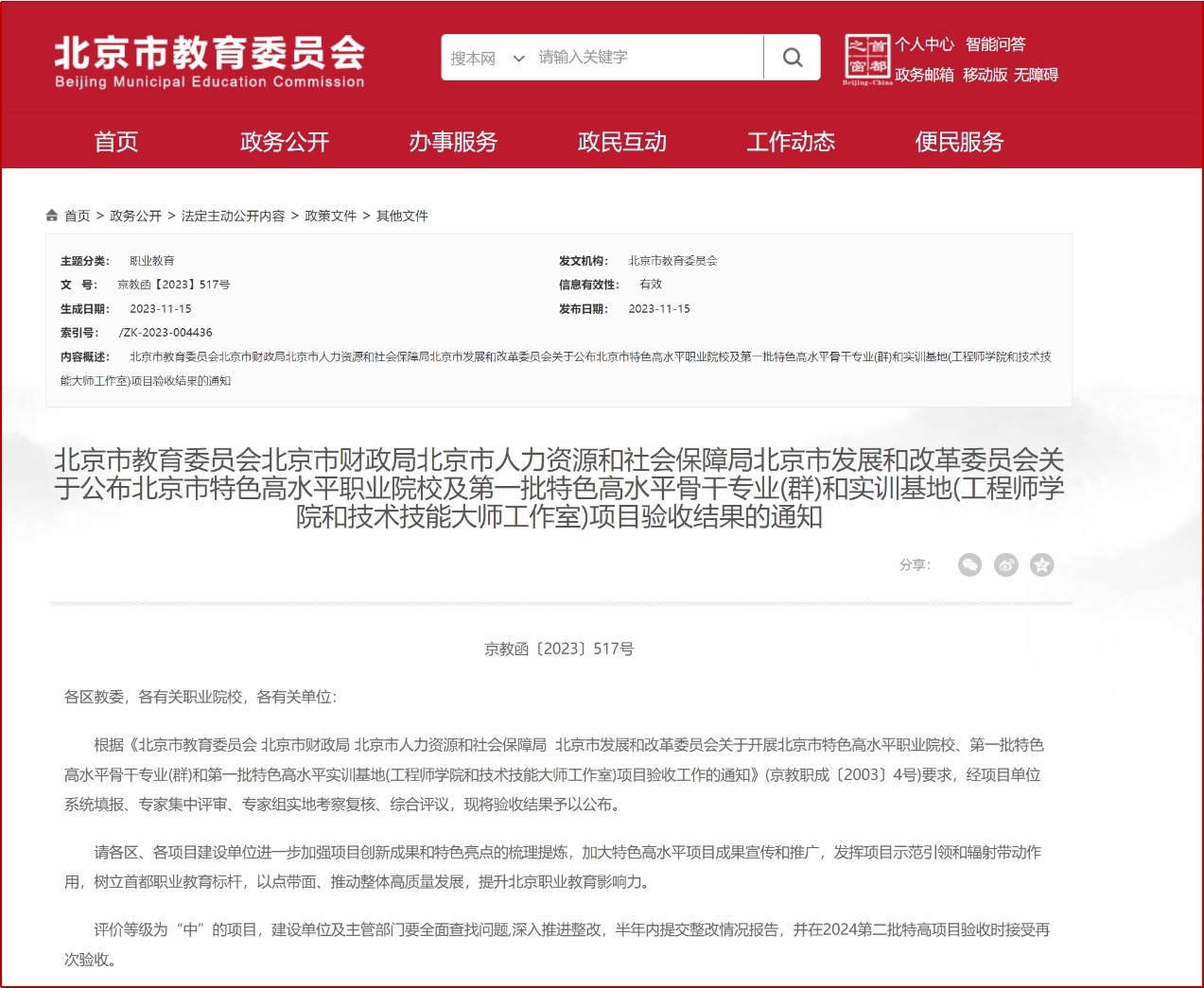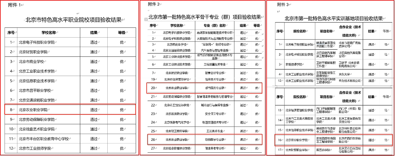 11月15日,北京市教育委员会、北京市财政局、北京市人力资源和社会保障局、北京市发展和改革委员会联合发文,公布北京市特色高水平职业院校(以下简称“特高校”)及第一批特色高水平骨干专业(群)(以下简称“特高专业群”)和实训基地(工程师学院和技术技能大师工作室)(以下简称“工程师学院”和“大师工作室”)项目验收结果。Beat365“特高校”项目、“都市园艺、动物医学特高专业群”项目、“首农西郊农场园艺师工程师学院”项目验收结果均为“优”,圆满完成北京市“特高校”首批建设任务。