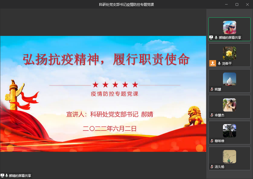 面对当前严峻复杂疫情防控形势,为进一步提升基层党组织凝聚力、战斗力和创新力,6月2日上午,科研处党支部开展支部书记讲疫情防控专题党课活动。