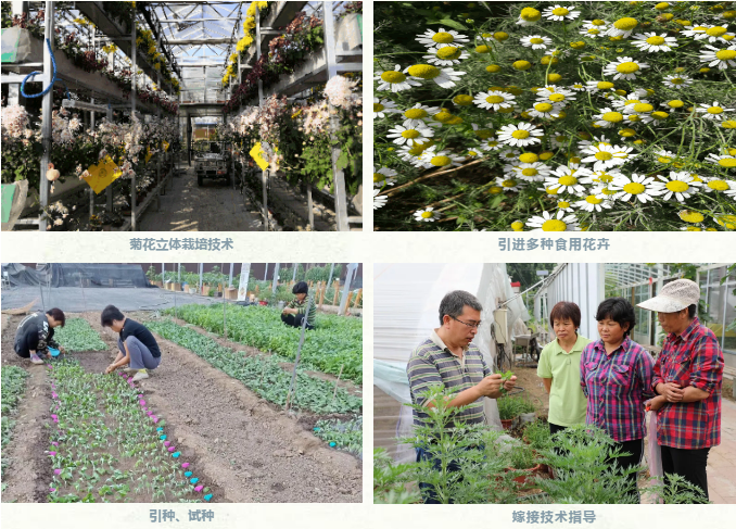 一是多措并举改进食用菊花生产技术。经过多年的筛选培育,食用菊花品种已经达到十三种,在北京市乃至全国花色品种最多。通过丰富品种、种苗脱毒复壮、调控花期及标准化生产等技术措施,食用菊的产量和品质大幅提升,亩产量达近千公斤,亩产值超十万元,通过技术措施,食用菊花花期由原来的一个多月,延长到现在的近半年。年出售优质种苗近10万株,辐射带动京郊及湖北等京外省份菊花产业发展,助力脱贫攻坚。
