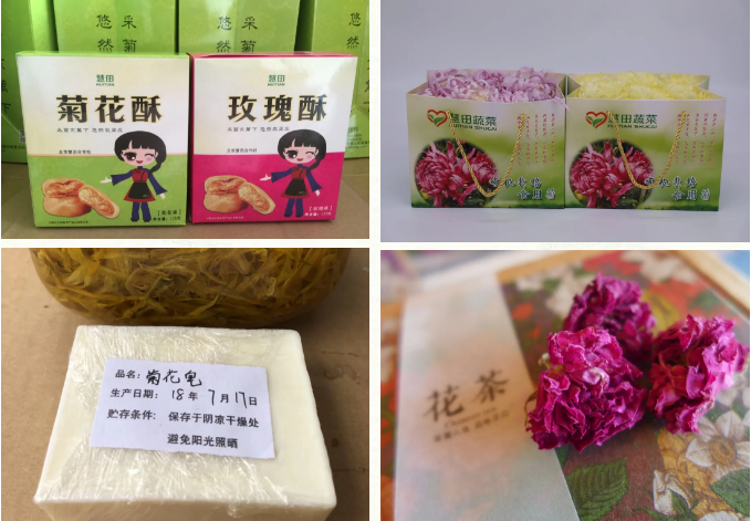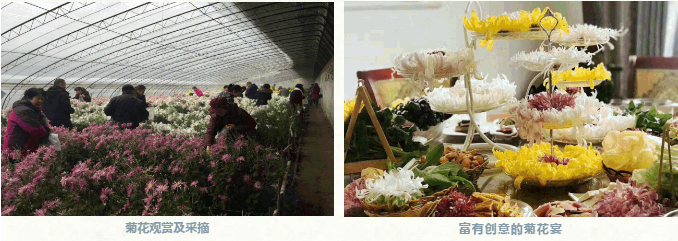 二是延伸产业链,更好的为农民创收。除了食用菊花的技术指导,还指导研发了菊花酒、菊花酥、菊花皂等特色产品,使游客赏菊、吃菊后还可以带走喜欢的菊花产品,提高了菊花的附加值。打造特色菊花宴,带动村内十余户困难家庭开办了菊花宴小院,在菊花供应期内,户均收入达12万元以上。除了食用菊以外,还种植了观赏菊花400多种,有标本菊、嫁接菊、小菊盆景等7种观赏类型,周庄村因菊花产业还被评为全国一村一品产业示范村,有效的带动了当地农民的致富。