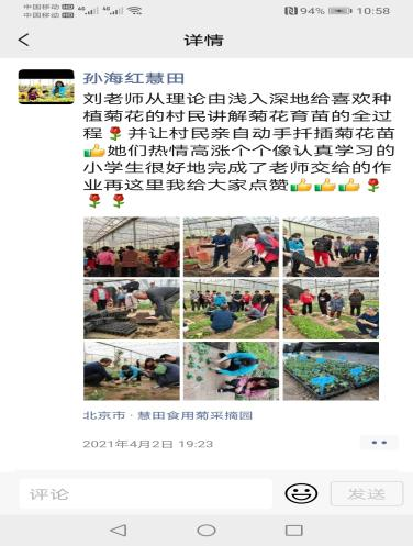 园艺系副教授刘旭富根据市面上食用菊花品种相对单一、竞争力不高、难以获得消费者的青睐的现状,经多年筛选,通过适口性、观赏性、营养及有害物质的测定,再经反复的抗性及产量试种后最终筛选出5个优质食用菊品种。随后他将这些成果应用到周庄村慧田合作社的生产中,又经过多年努力引种、筛选和培育,目前周庄科技小院已拥有食用菊品种13个。