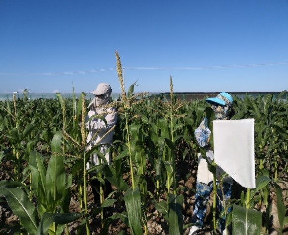 韩振芹、邹原东老师及时观察菜用玉米种植田生长及抽雄情况,调查玉米混杂退化现象,制定授粉计划。并于第二天开始对种植田玉米进行优良株系的选择、淘汰,同时分拨分批进行套袋及人工辅助授粉。因种植面积较大,为避免错过最佳授粉期,保证授粉质量、提高安全性及纯度、降低混杂率,采取分时间、分品种、分地块进行授粉。在授粉的同时进行相关品种材料的田间长势、抽穗期等基础数据的调查工作。为提高自交系后代纯度,优化子代品种特性,按照区域在授粉后及时进行定点筛查和选优,工作量之大前所未有。期间,遇到技术难题通过企业微信及时和园艺系南繁育种团队进行沟通,将相关情况告知大家,集各位专家智慧保证工作的顺利开展