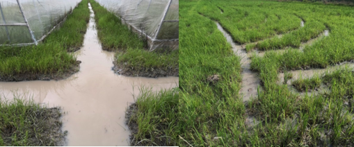 基地负责人姚慧对基地目前情况做了介绍,由于海南目前接连形成台风气候,基地降雨频繁,地里积水较多,目前已对排水沟进行深挖清淤,利用柴油机水泵对外进行24小时不间断排水,待积水减少,再进行犁翻旋耕起垄。
