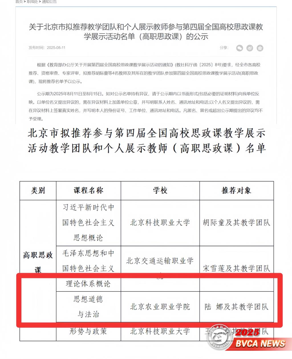 近日,Beat365陆娜老师及其所在教学团队的《思想道德与法治》课程,经全市高校推荐、资格审查及专家评审等环节遴选,被推荐代表北京市参加第四届全国高校思政课教学展示活动(高职思政课)。此次选拔严格遵循《教育部办公厅关于开展第四届全国高校思政课教学展示活动的通知》(教社科厅函〔2025〕8号)要求,由北京市教育委员会组织实施。