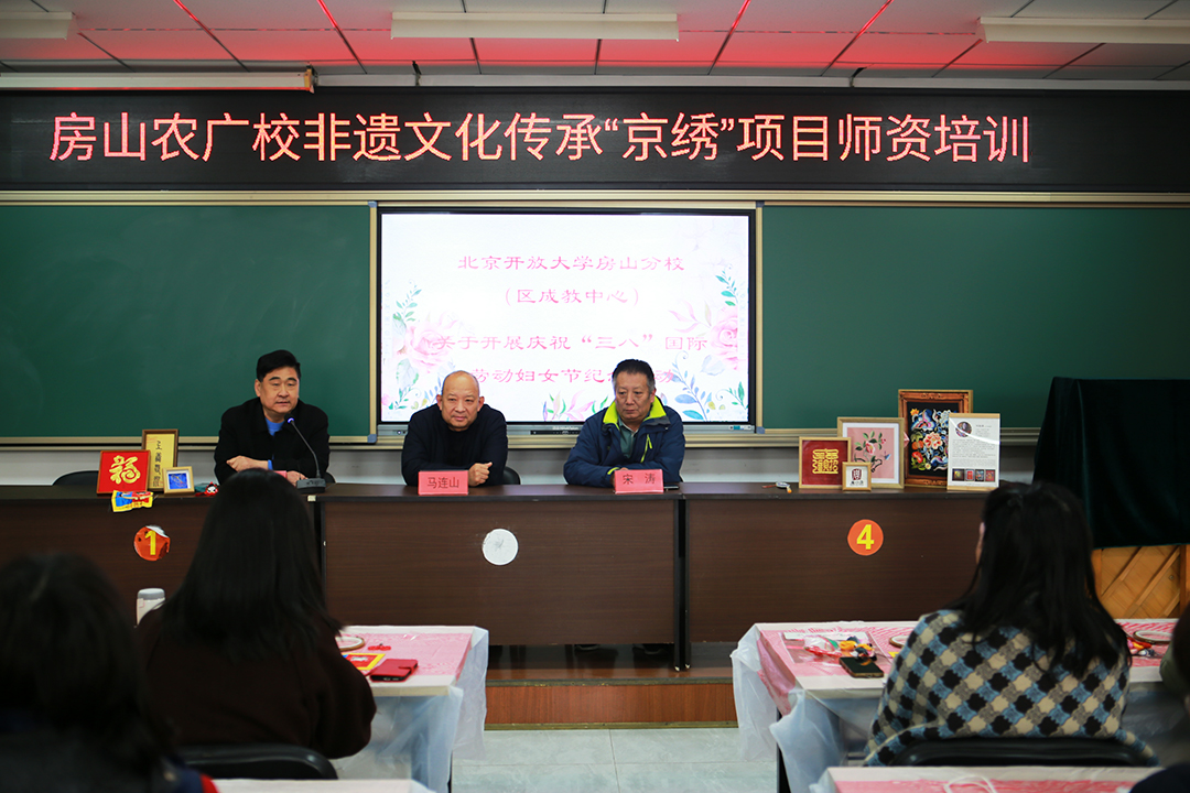 为庆祝三八国际妇女节,传承和弘扬中华优秀传统文化,感受非遗魅力。3月5日上午,房山区农广校成功举办了一场别开生面的燕京八绝京绣技艺师资培训活动。房山区成人教育中心党委书记,北京开放大学房山分校校长马连山、工会主席宋涛等领导出席活动并为全体女职工送上节日祝福。70余名女教职工参加。