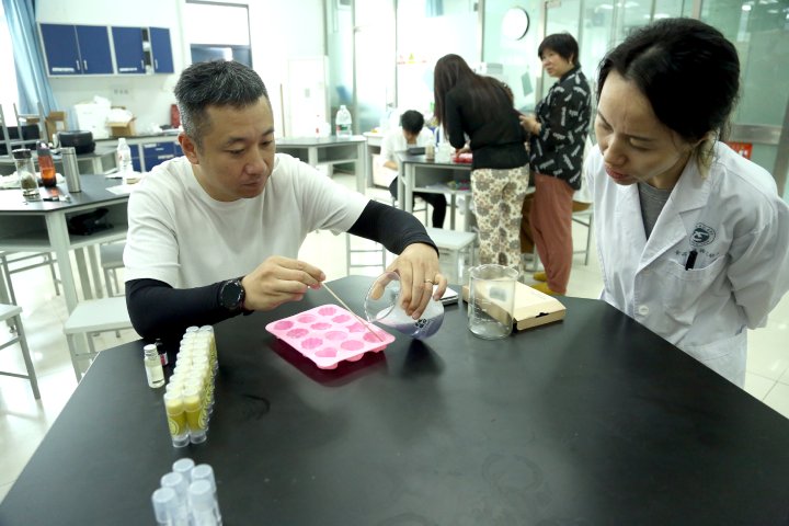 湖畔实训教室里,王伟青副教授与李凌燕高级实验师带领学员走进“植萃工坊”。他们精选生活中易得的薄荷叶、艾草、薰衣草等原料,传授植物萃取核心技术——从原料挑选到配方调配,解析每种植物的独特功效:唇膏的滋润保湿、艾草薄荷膏的舒缓清凉、精油手工皂的温和清洁,背后都是精准的配比智慧;从基础熔模到手工塑形,脱模、上色、灌装、封口,每一步工艺都凝聚着匠心。学员们在研磨、搅拌、塑形中,既感受着天然植物的治愈力,更触摸到“绿色创业”的可能性——这些实用技能,既能为生活添彩,更能成为家庭农场的特色增值服务。