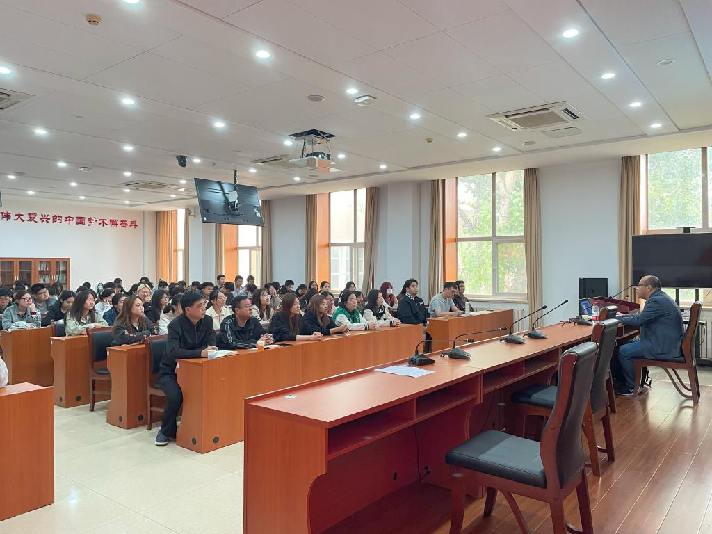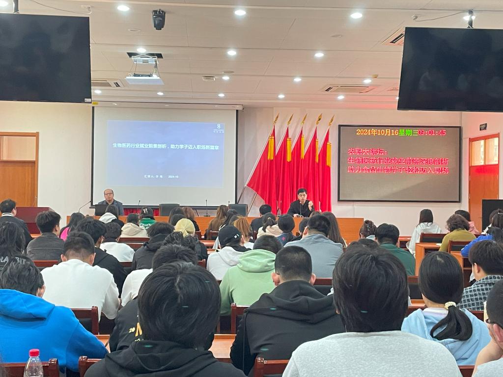 李亮分别从生物医药行业市场潜力、主要发展领域与趋势、人才需求现状、就业方向以及如何提升就业竞争力等方面为现场的师生们做了深入浅出的介绍,阐述了生物行业强劲的发展态势以及将来可能的蓝海赛道。他根据自身的成长经历以及多年企业管理经验,鼓励同学们打牢专业知识根基,保持对所选领域的浓厚兴趣,抓住一切机会提升综合素质,学会在逆境中坚持,在坚持中成长,在成长中成才。