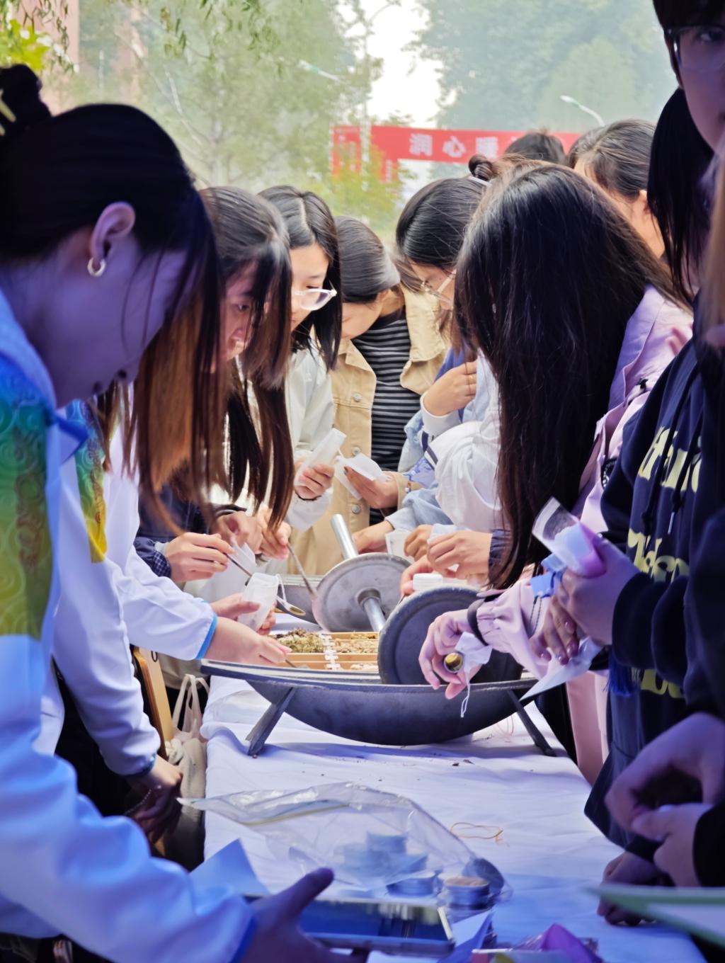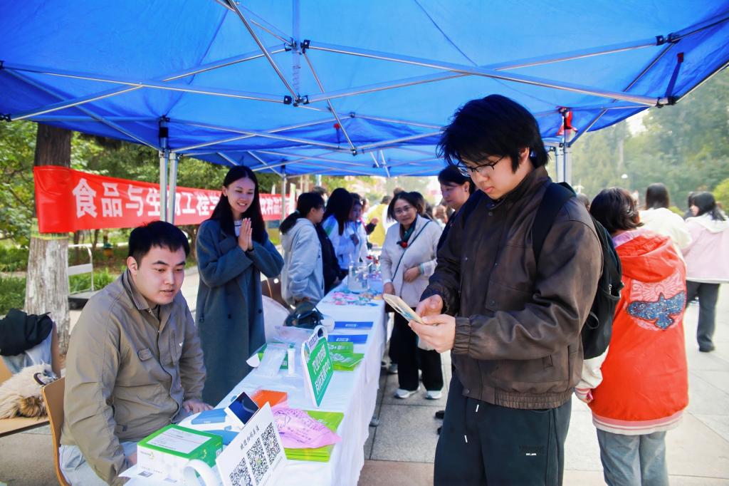 讲座后,师生移步广场参与互动体验。VR设备、快速检测等科普摊位让大家在动手实践中深化理解。生物技术党支部还展示了手工唇膏、精油手工皂等学生自制产品,体现专业特色与实践成果。