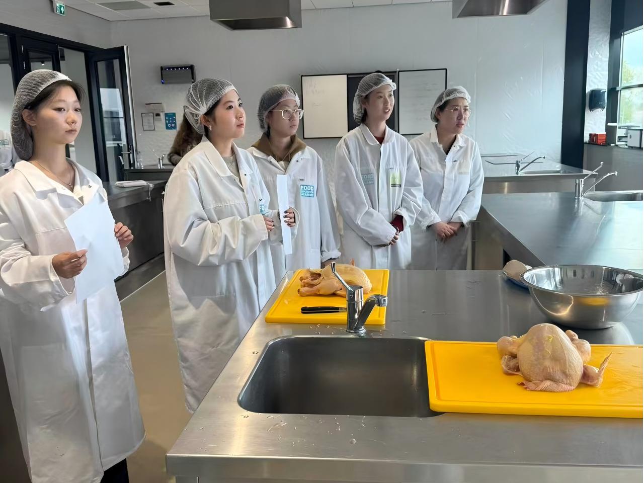 在朗蒂斯集团实训基地,中荷学生结对参与鸡肉解剖与烹饪课程。课程以问题为导向,引导学生通过触摸、嗅觉、视觉与思考,辨别玉米饲养鸡与有机走地鸡的差异,并协作完成鸡肉分割、烹饪与成果品鉴。同学们在实践中深化了对食品科学的理解,也增进了跨文化友谊。