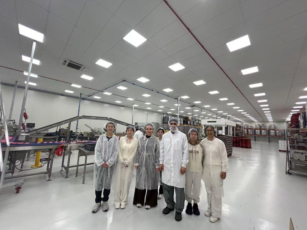 代表团还参观了生命学院大三学生实习所在的巧克力工厂,深入考察了可做2000多种配方的巧克力生产线,包括原料储存、配料、粉碎研磨以及注模、冷却、脱模、包装、喷码、装箱等全自动化流程。同学们对巧克力生产的全程质量控制与行业前沿技术有了更直观的认识。